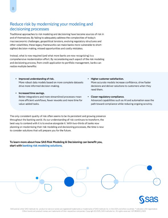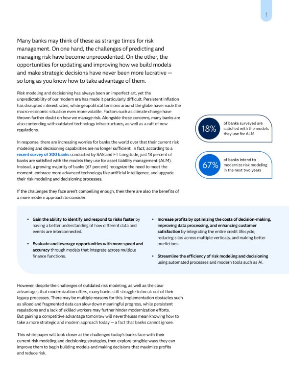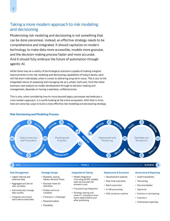 In this whitepaper, I explored the challenges banks face with current risk modeling and decisioning strategies, then aligned these challenges with SAS solutions. This project was one of three whitepapers I was commisioned to write. I built it out from scratch based on an extensive amount of research and SME interviews.